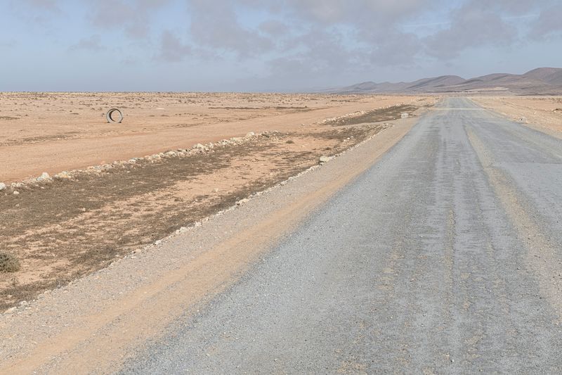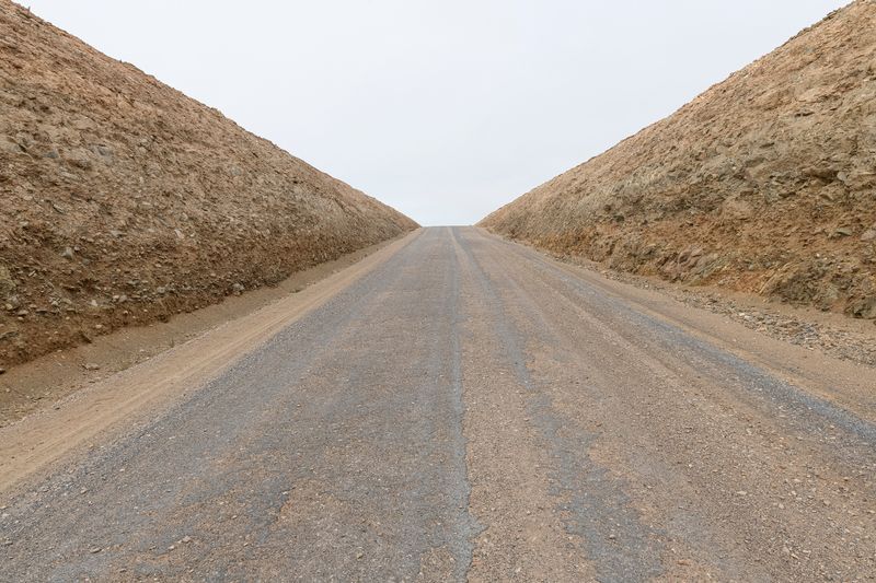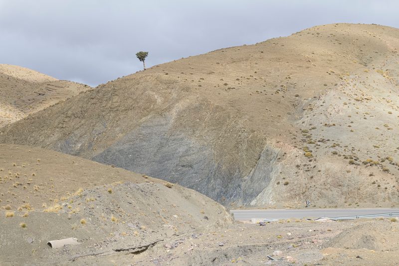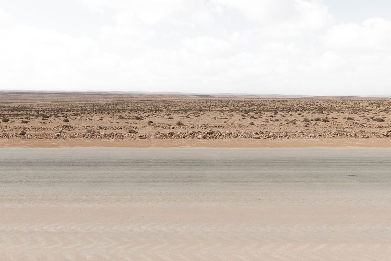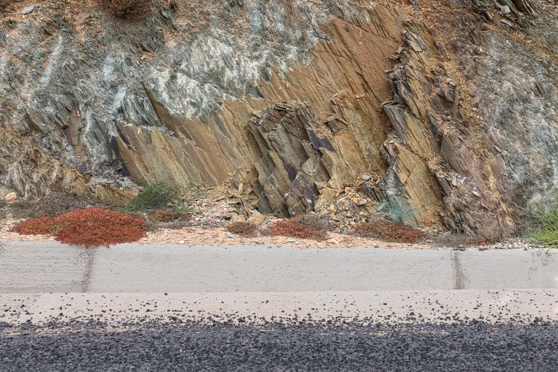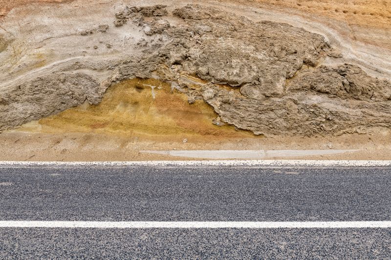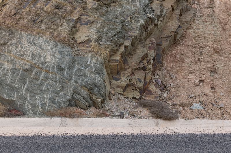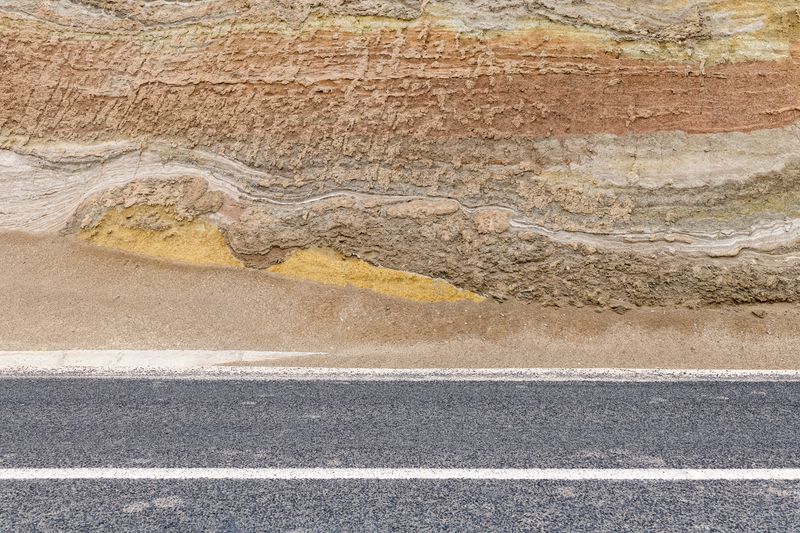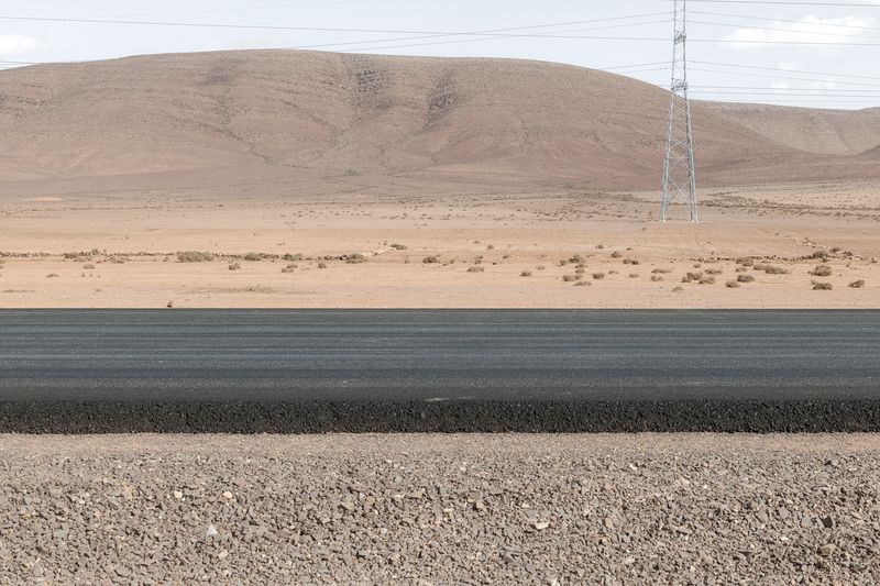 Ninguna concesión viajera en este fotógrafo, ninguna fascinación exótica. Se despliega la galería de imágenes, avanza la cinta de asfalto de la carretera al Sur del Sur, hay alguna señal de tráfico y algún mojón de cemento y algún poste de una línea eléctrica, inexorablemente hay un recorrido de no sabes dónde a no sabemos dónde, sin población alguna a la vista (apenas unas casuchas terrosas al borde de un barranco, al fondo de una de las imágenes), casi sin otro rastro de presencia humana más que esas casuchas, más allá de los que dejaron quienes trazaron la carretera o de quienes la asfaltaron o de quienes plantaron las señales o de quienes construyeron los mojones de cemento o de quienes alzaron los postes del tendido eléctrico.