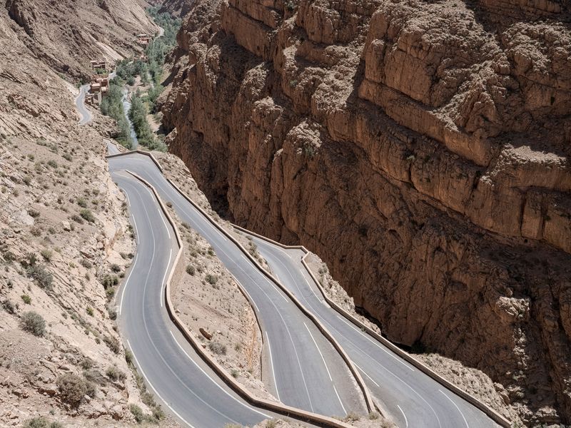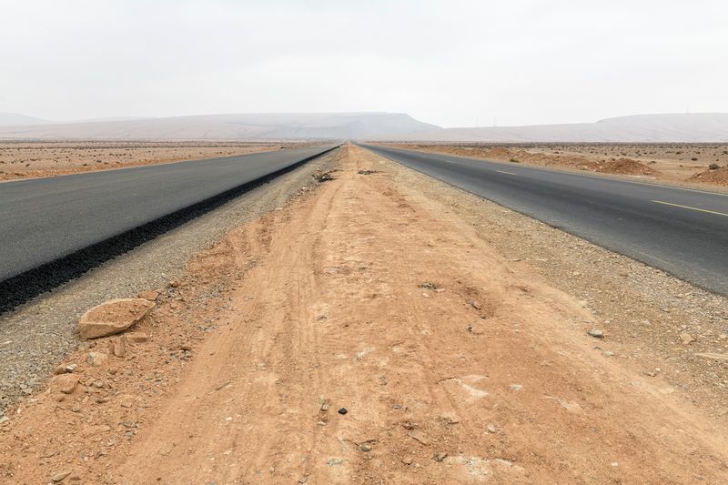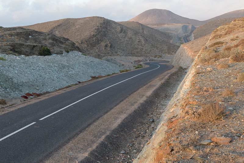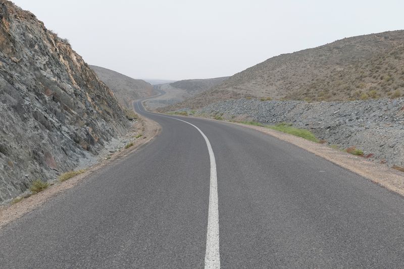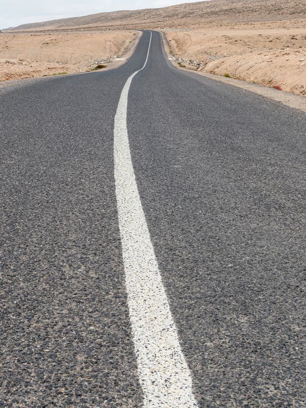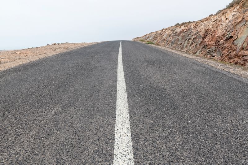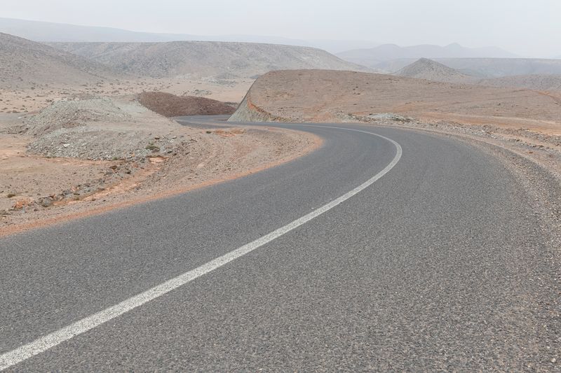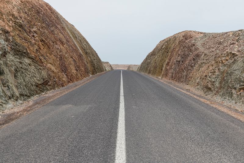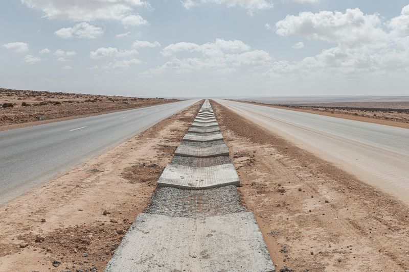 Ninguna concesión viajera en este fotógrafo, ninguna fascinación exótica. Se despliega la galería de imágenes, avanza la cinta de asfalto de la carretera al Sur del Sur, hay alguna señal de tráfico y algún mojón de cemento y algún poste de una línea eléctrica, inexorablemente hay un recorrido de no sabes dónde a no sabemos dónde, sin población alguna a la vista (apenas unas casuchas terrosas al borde de un barranco, al fondo de una de las imágenes), casi sin otro rastro de presencia humana más que esas casuchas, más allá de los que dejaron quienes trazaron la carretera o de quienes la asfaltaron o de quienes plantaron las señales o de quienes construyeron los mojones de cemento o de quienes alzaron los postes del tendido eléctrico.