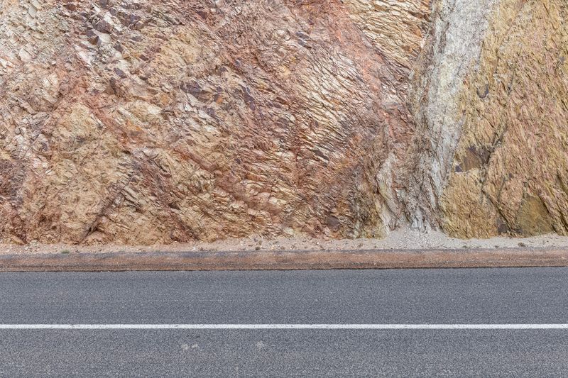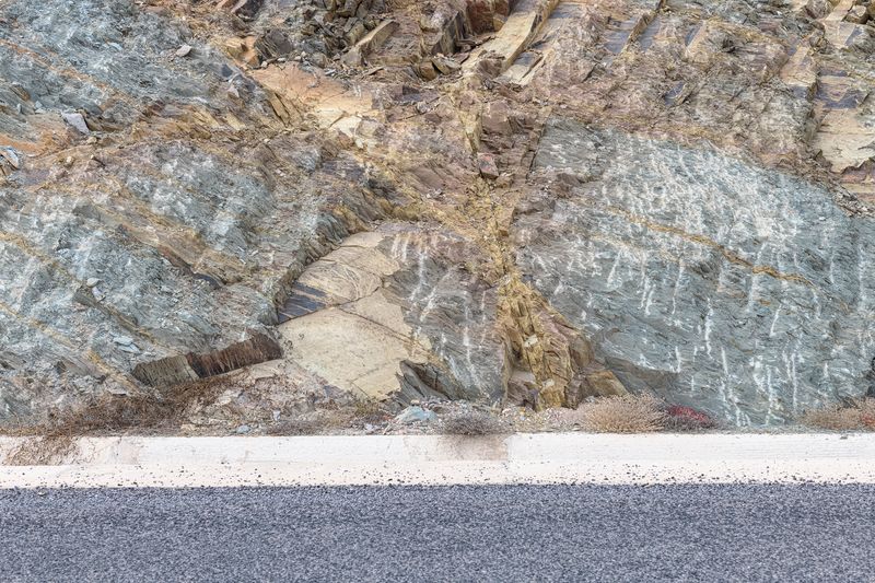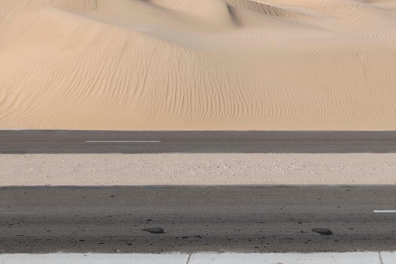 La belleza descomunal de estos parajes, de las tierras desérticas, de los pliegues monstruosos de las rocas, del rizado casi zen (Ryoan-Ji, etcétera) de las dunas, del asfalto y las líneas blancas que lo pautan, va más allá de lo humano. Belleza lunar, diríase por momentos, pese al sol que se adivina de justicia. Texturas. Coloridos: ocres, amarillos, negros, grises, pardos, y asomando en raras ocasiones, un verde tímido. Todo con una exactitud y una precisión absolutamente implacables, y la palabra precisión me lleva a recordar que tanto en pintura como en fotografía hubo hace un siglo, en los Estados Unidos, un muy interesante movimiento que se llamó así, precisionism.